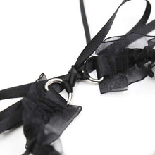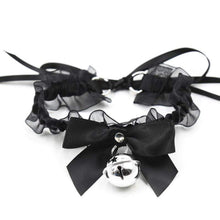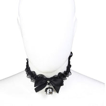 This dainty black collar will adorn your little girl's lovely, flawless neck. This beautiful neckpiece features black satin material, covered with a layer of black silk organza fabric, which forms graceful ruffles. In the center is a black satin bow that gives the collar a more feminine touch. From it hangs a bell that will chime when your girl hops or runs. Of course, you will still hear the jingling when you bang her pussy.